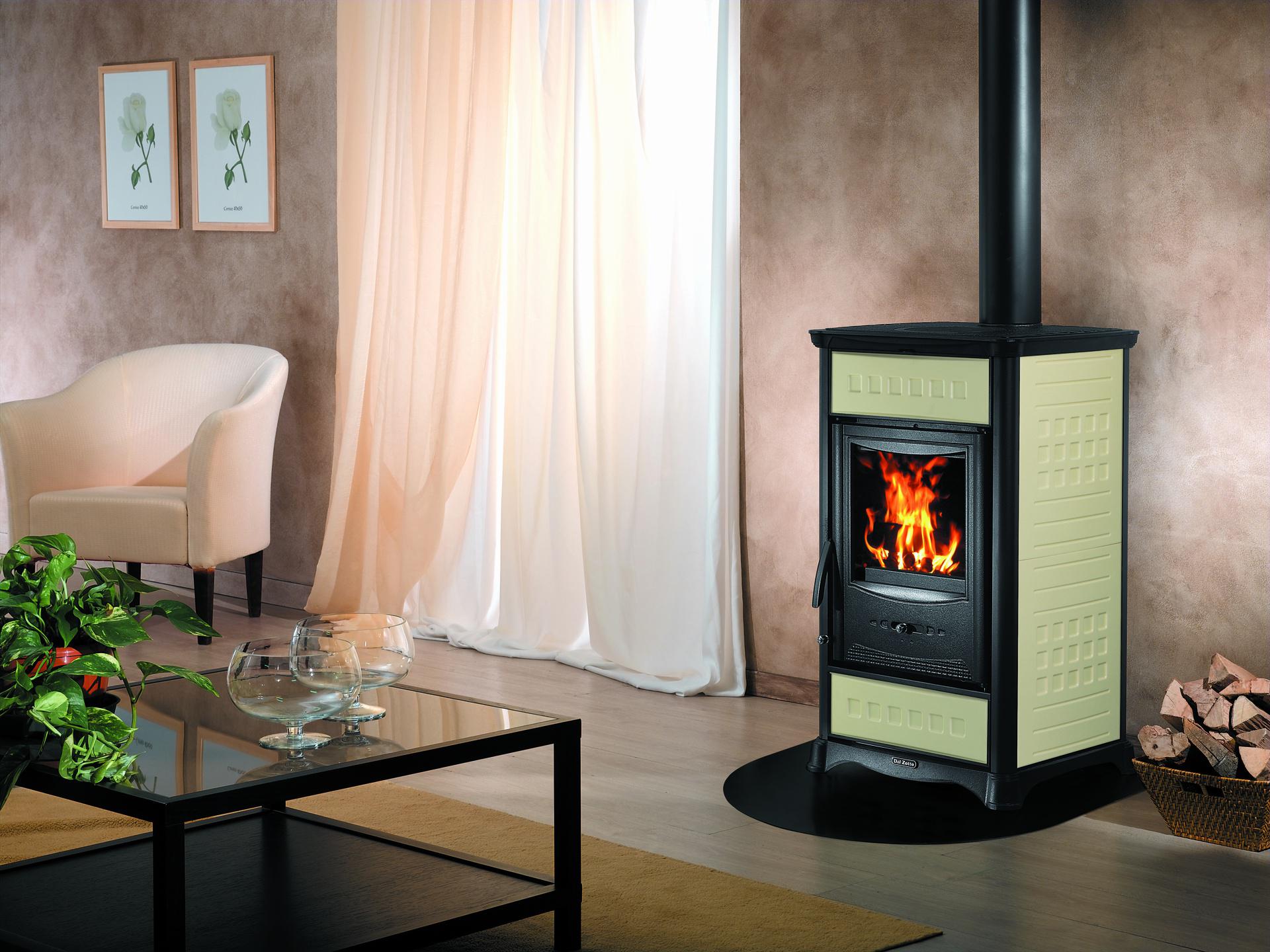 Štedilnik na drva, namenjen samostojnemu ogrevanju hiše s povezavo naprave z vodovodnim in ogrevalnim sistemom. Zunanja obloga iz majolike. Kotel z debelimi stenami. Litoželezne kuhalna plošča z obroči.