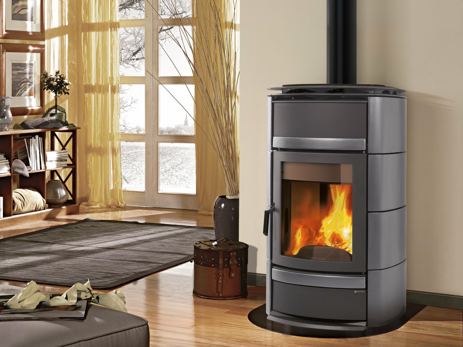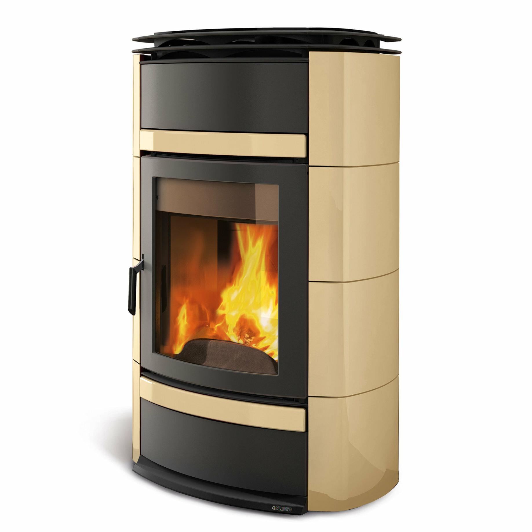 Termo peč na drva z varnostno napravo DSA (ventil DSA ni vključen) in ročno izdelano oblogo iz majolike. Notranja obloga kurišča iz litega železa in jekla. Zunanji dovod zraka. Emajlirana vrata iz litega železa z ukrivljenim keramičnim steklom za širok pogled na ogenj.