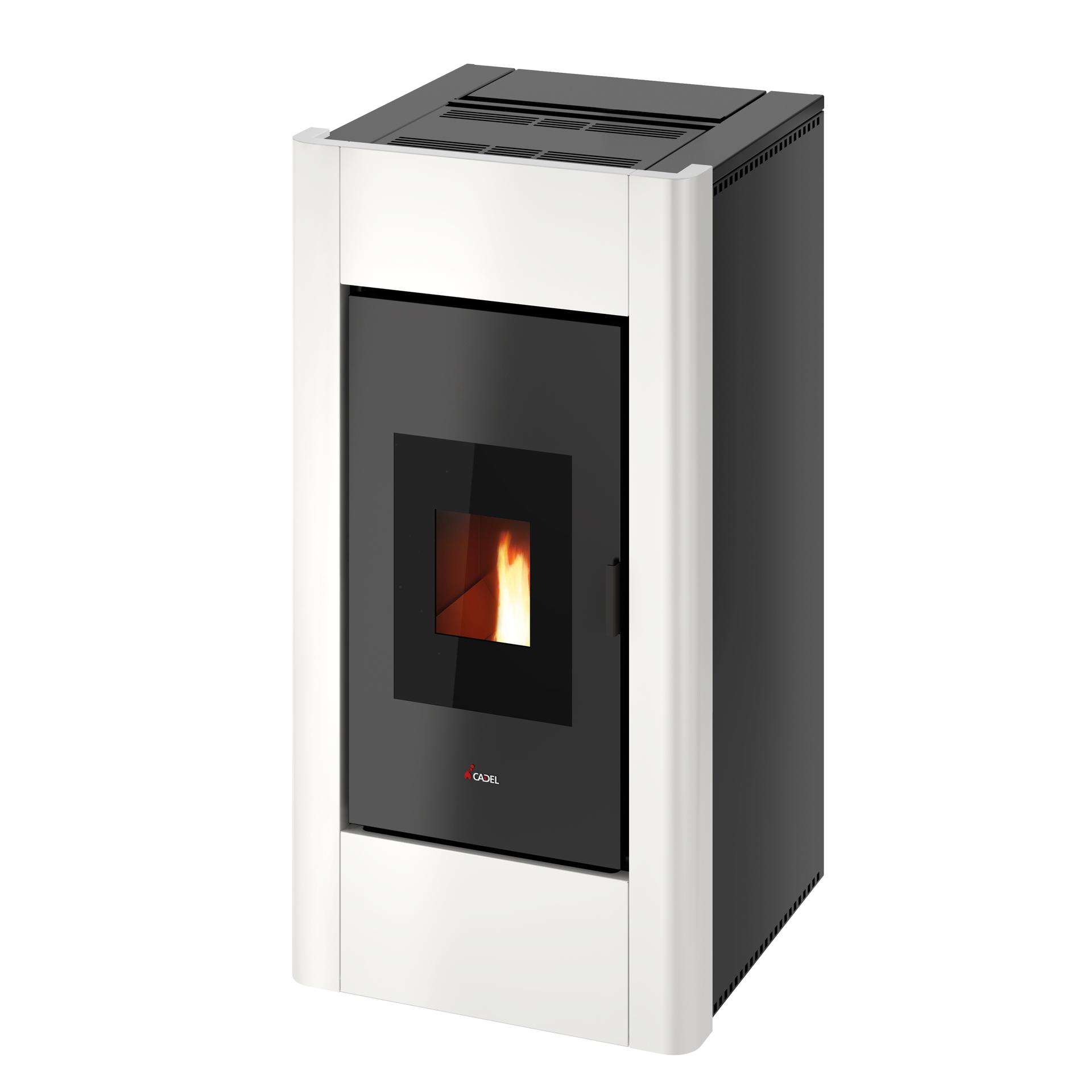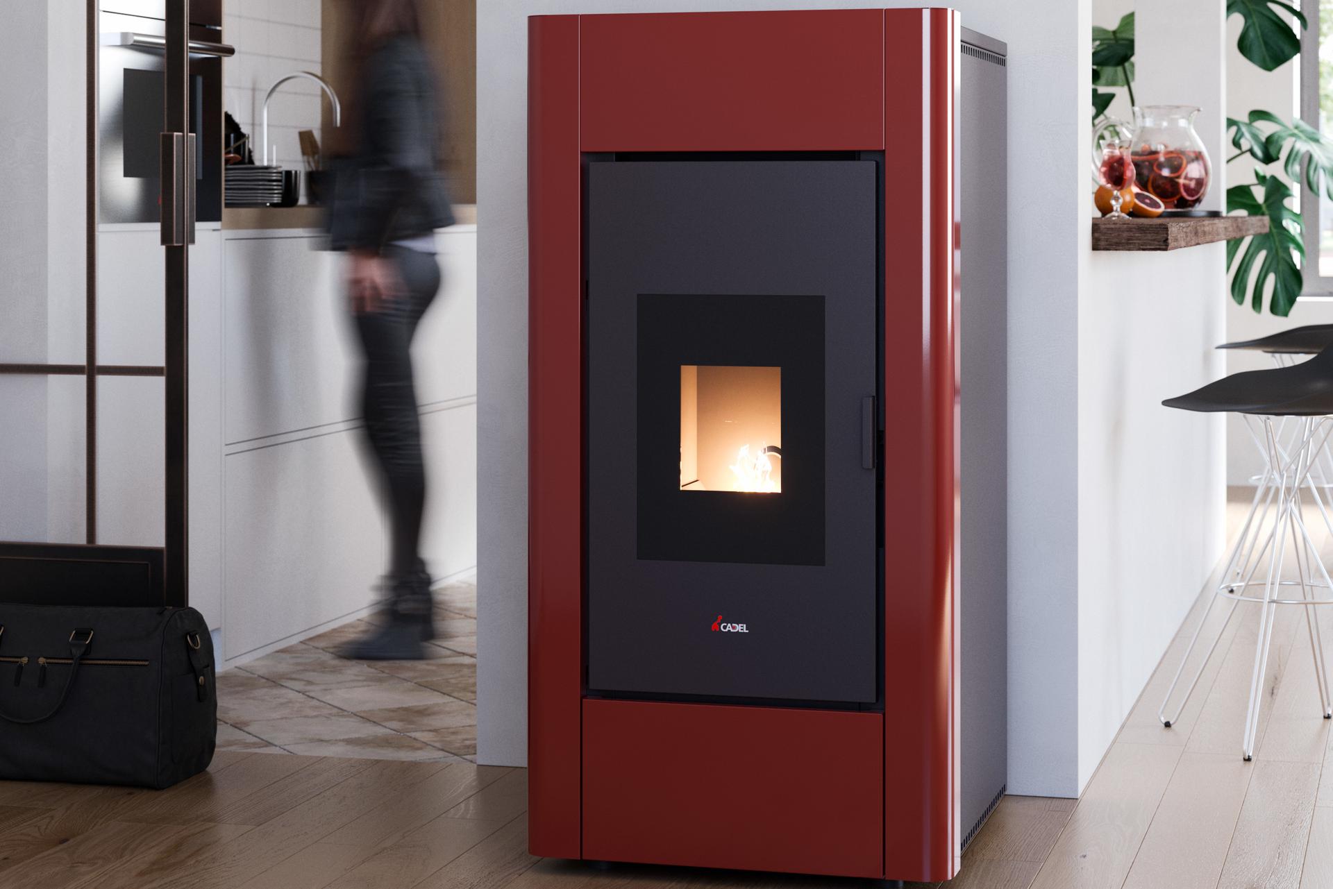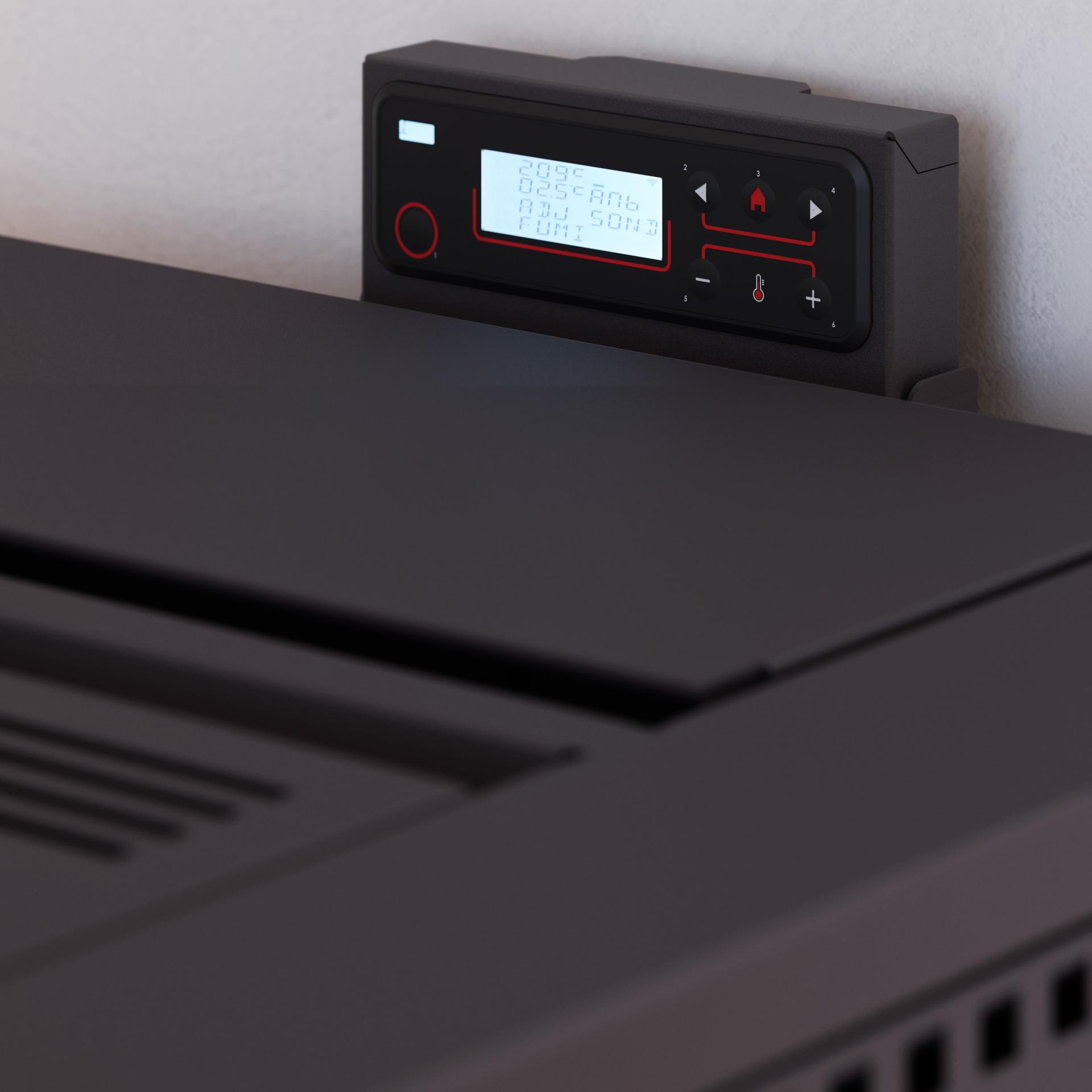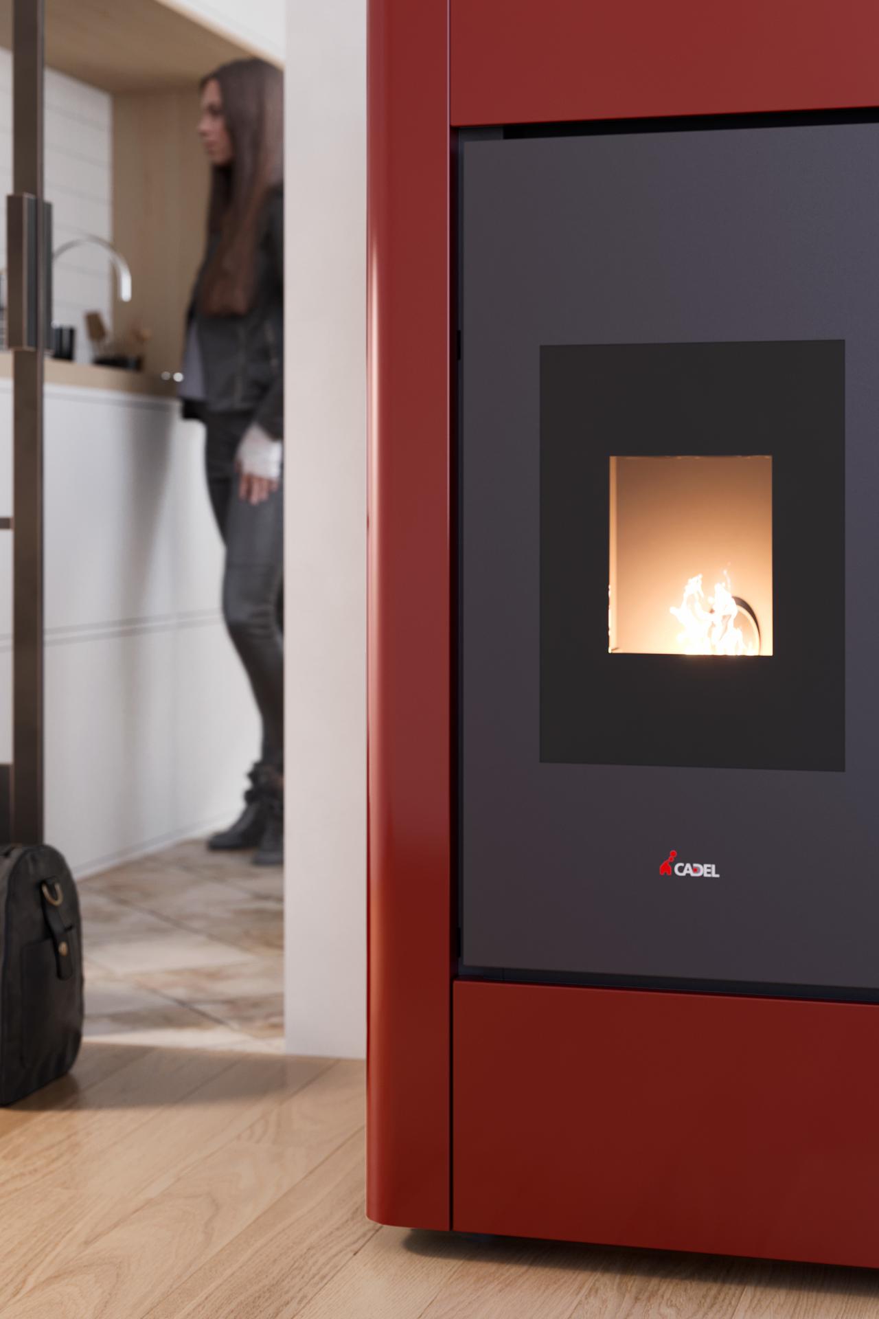 Termo kaminska peč na pelete z impresivnim dizajnom, ki jo odlikuje moč 30 kW in hidravlični sistem, ki v celoti izkoristi proizvedeno toploto in jo razdeli v vse prostore v celotni stavbi. Prevleka iz pobarvanega jekla.