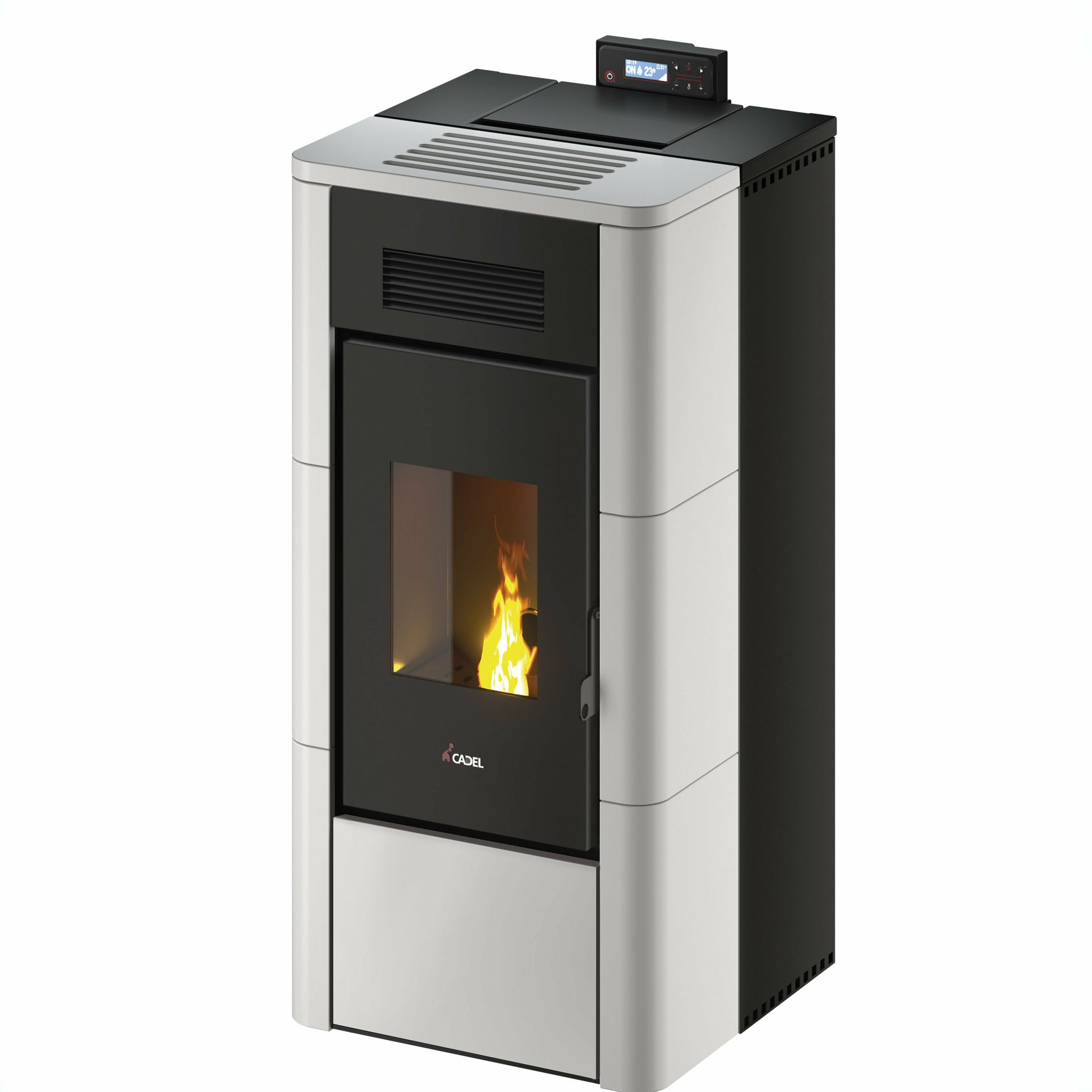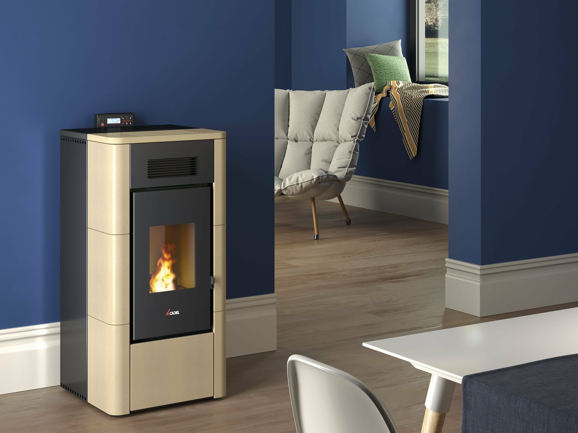 Vodna kaminska peč na pelete z minimalnim elegantnim dizajnom in zunanjo oblogo v majoliki.