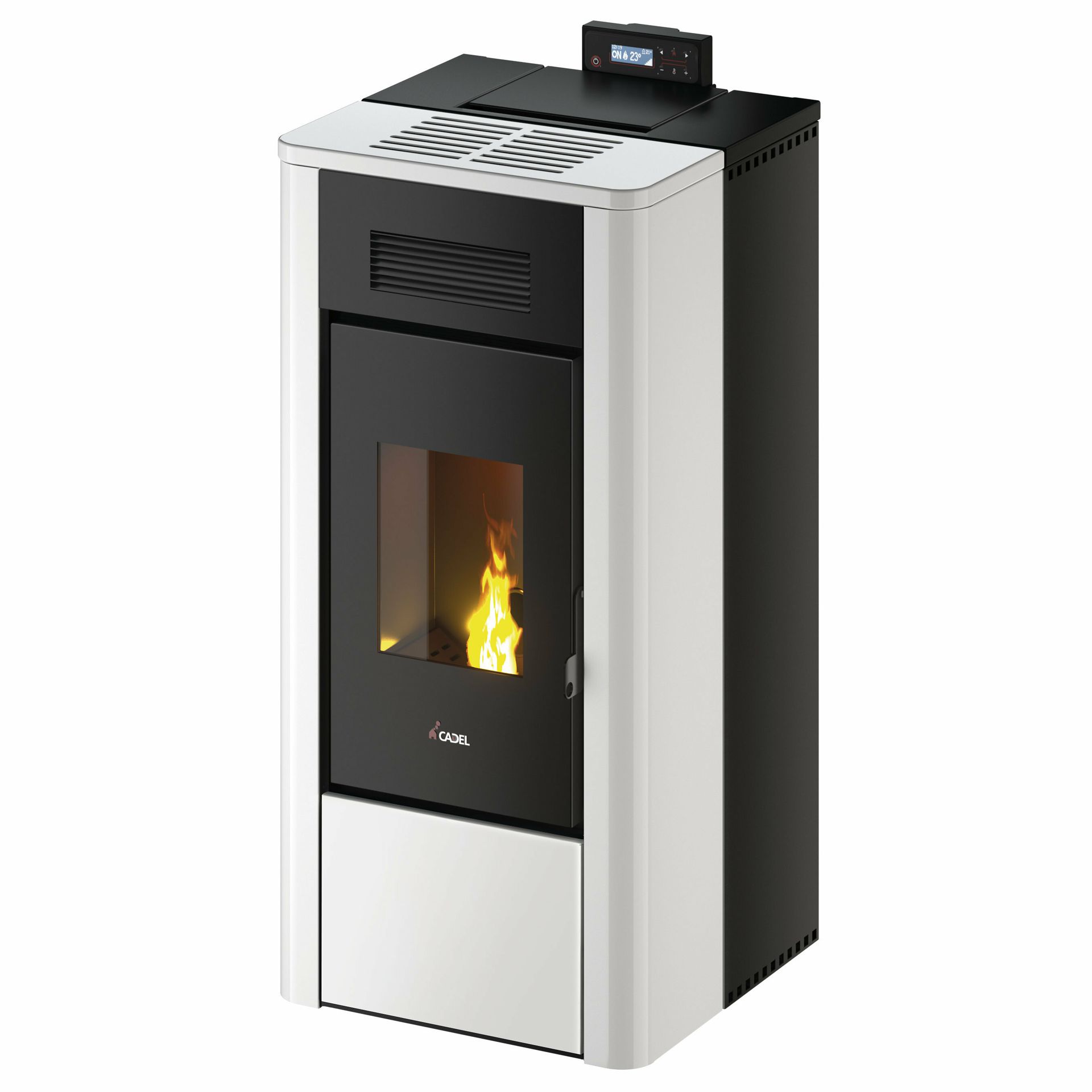 Vodna peč na pelete z minimalnim elegantnim dizajnom z zunanjo oblogo iz barvanega jekla.