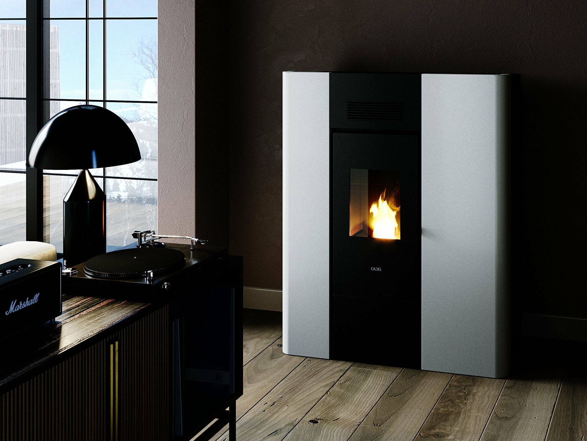 Vodna kaminska peč z vpihom toplega zraka, zasnovana za manjše prostore, je opremljena s kovinsko oblogo.