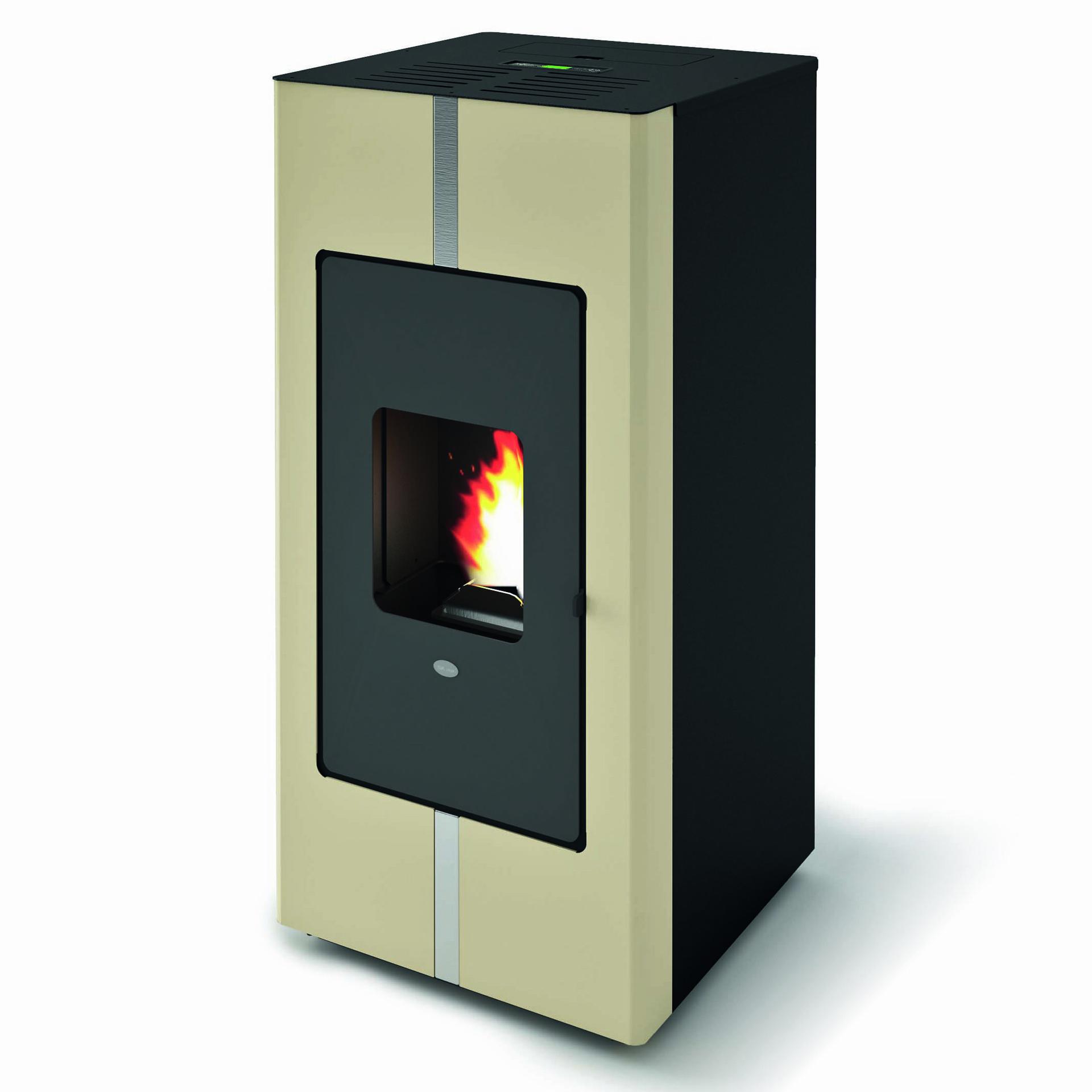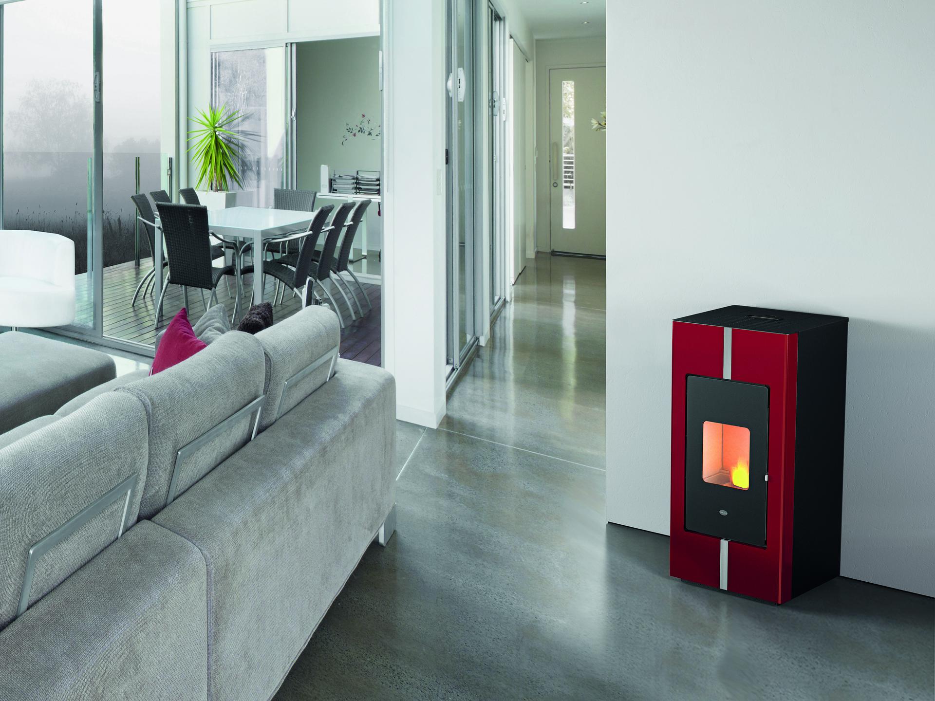 Sodobna peč na pelete za sisteme centralnega ogrevanja, pripravljena za namestitev v vaše bivalne prostore. Jekleno ohišje z linearno zasnovo.