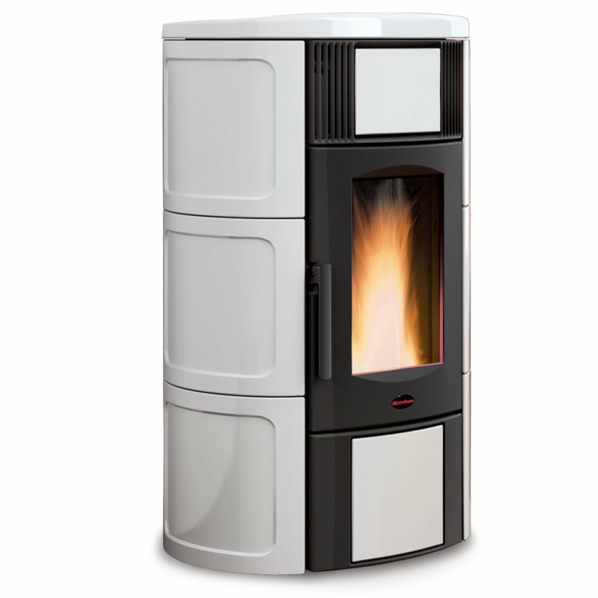 Termo peč na pelete z ventilacijo, zunanjo oblogo v majoliki in širokim pogledom na ogenj. Čelni vpih toplega zraka z namenskim ventilatorjem, ki ga je mogoče izključiti.