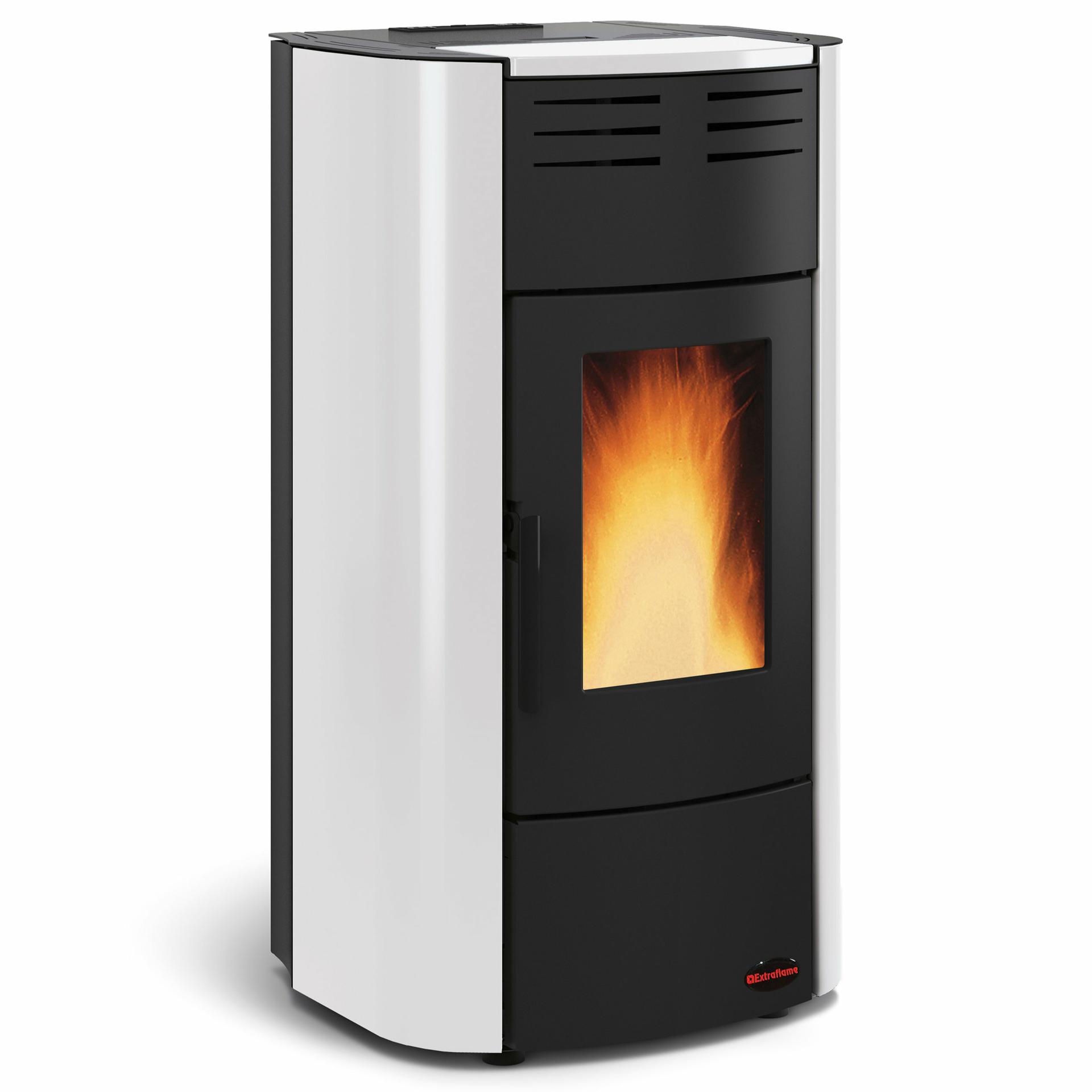 Vodna peč na pelete z ventilacijo, oblogo iz visokotemperaturno lakiranega jekla in širokim pogledom na ogenj. Inovativni prilagodljivi sistem za prilagajanje in izenačevanje dovoda zgorevalnega zraka. Hermetični zalogovnik. Čelni vpih toplega zraka z ventilatorjem, ki ga je mogoče izključiti.