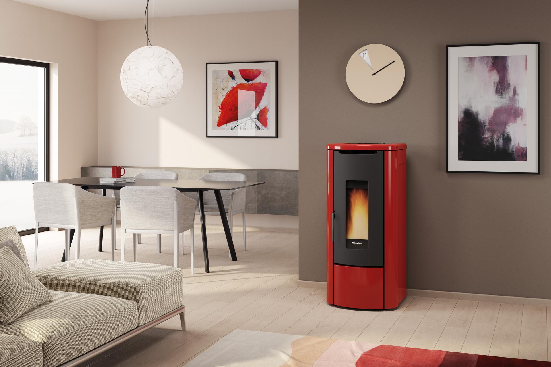 Elegantna in zmogljiva termo peč z visokotemperaturno pobarvanim jeklenim ohišjem in zgornjim pokrovom iz majolike. Zaobljena oblika omogoča enostavno postavitev peči v prostor.